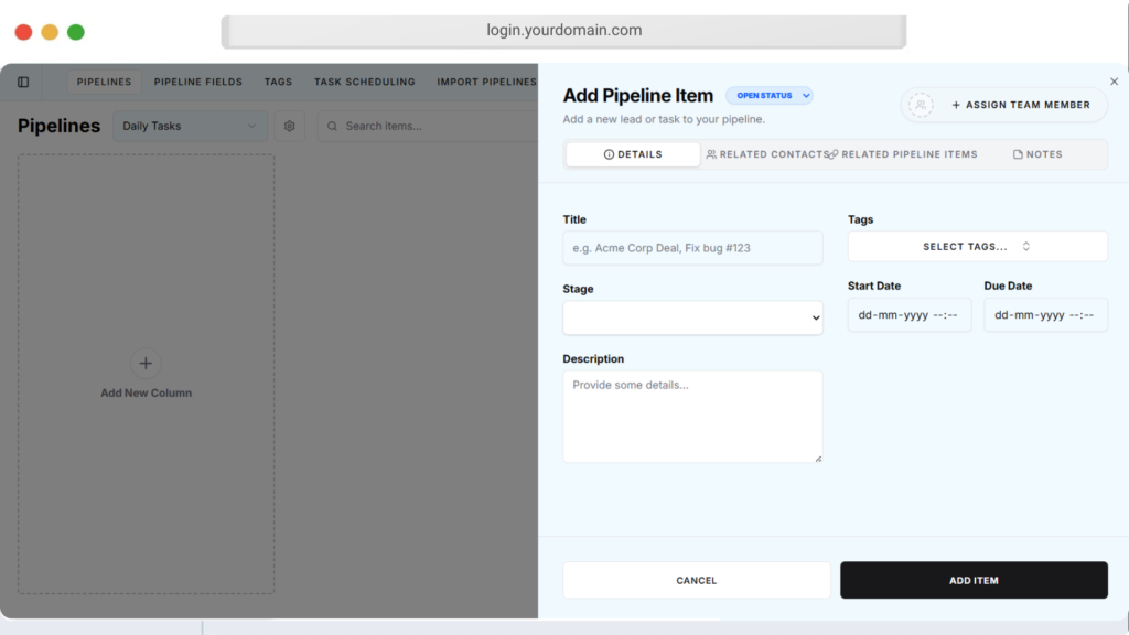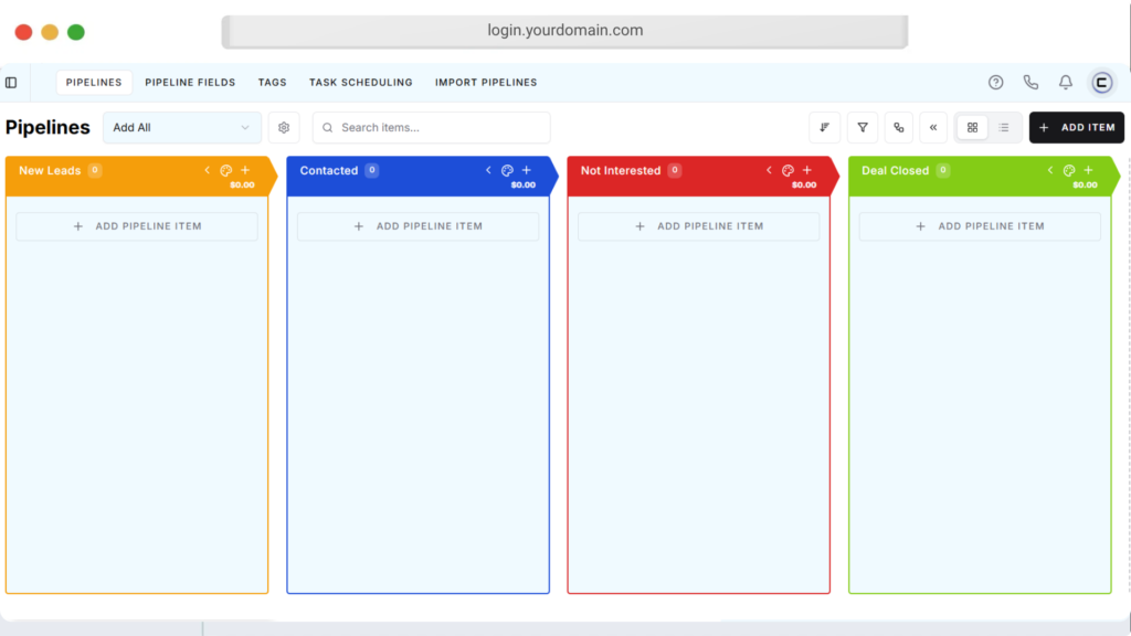 Track and manage every lead through customizable sales pipelines, helping you organize deals, monitor progress, and close more clients efficiently from one place. π